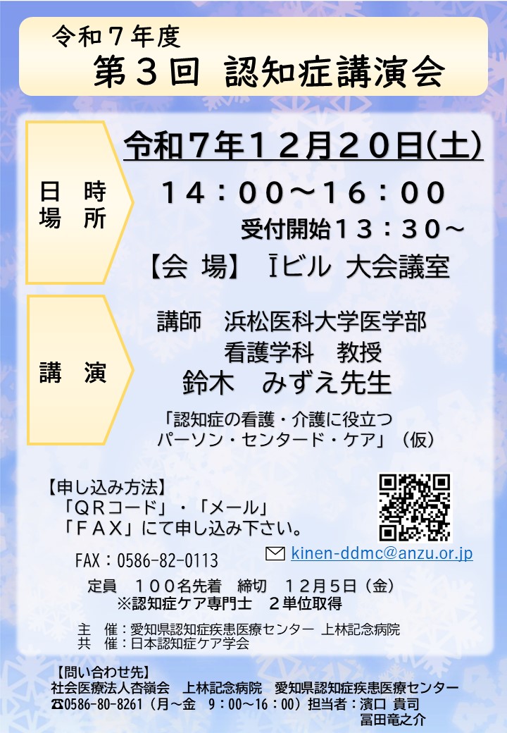 令和7年12月20日(土)に開催します、令和7年度第3回認知症講演会 参加申し込みフォームです。