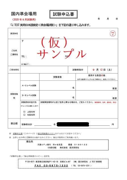 (3)「実施要項」の最後のページにある「申込書」に必要事項を記入し、受験料をお振込みください。 (4)準会場実施お申込みフォーム(この画面の下部)より、「振込明細書」、「申込書」の画像 (jpgまたはjpeg限定)と「受験者一覧表」(excel)を登録し、お申込み情報をご入力ください。
