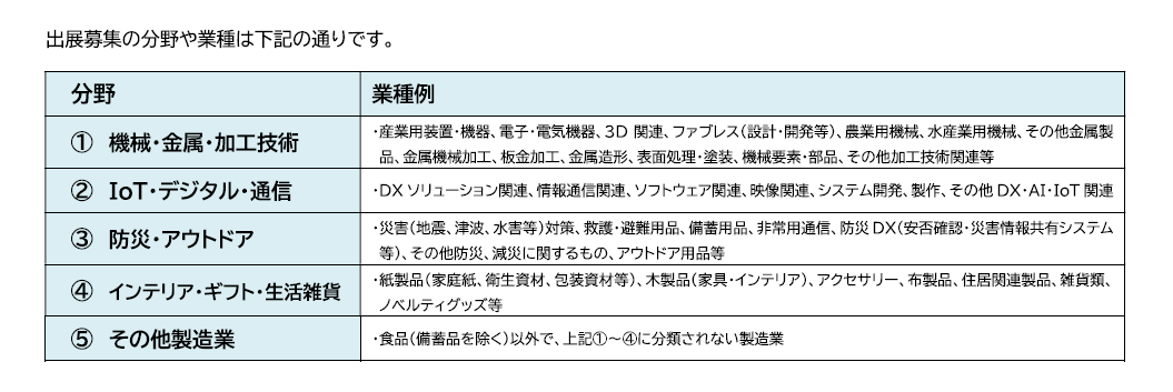 ①高知県内に本社または製造拠点を持ち、出展対象分野の「ものづくり」に携わる事業者・団体であること。