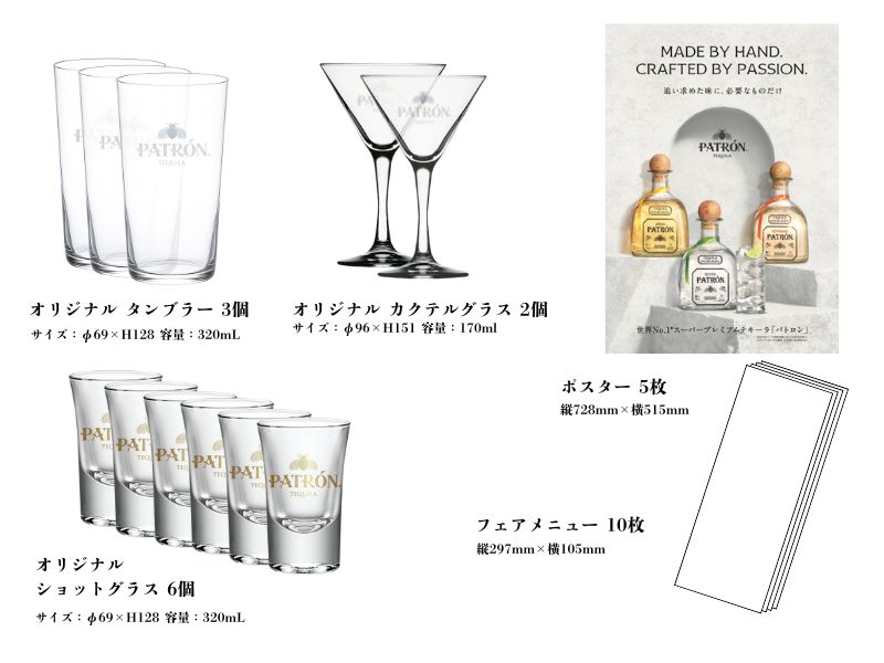 スーパープレミアムテキーラ「パトロン」では、全国の料飲店様と連携し、2025年11月14日(金)〜11月30日(日)の期間に『パトロンフェア』を開催いたします。フェアを実施いただける料飲店様には、特別な『パトロンフェア』キットを数量限定でご用意しております。ぜひお早めにお申し込みください。