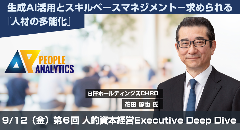 その「人的資本経営 Executive Deep Dive」の第6回目のセッションを2025年9月12日(金)14:00~15:00にオンラインで開催します。第6回目のゲストは日揮ホールディングス 専務執行役員 最高人事責任者(CHRO)花田 琢也 様をお迎えします。今回は「生成AI活用とスキルベースマネジメント-求められる『人材の多能化』」と題してお話しさせて頂きます。