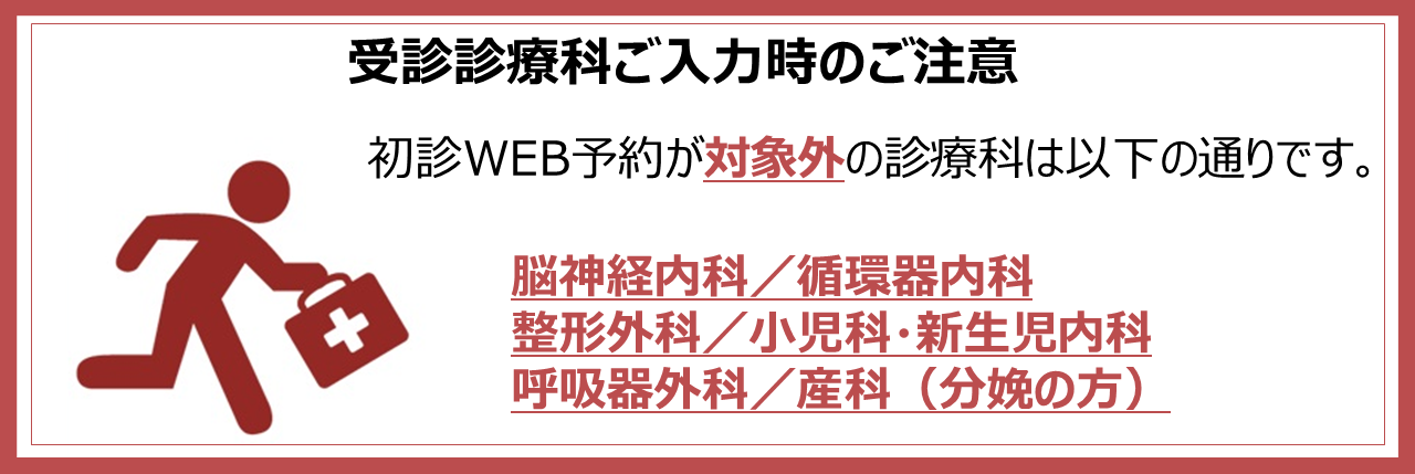 ⑤お申込みの内容に誤りがあった場合には、当日の診療をお断りすることがございます。入力内容に誤りの無い様、十分にご確認の上お申込みください。また、紹介状の内容によっては、お申込みいただいた診療科とは異なる診療科でのご受診に変更させていただく場合がございます。その際、ご来院日当日にご受診いただけない場合もございますので、予めご了承ください。